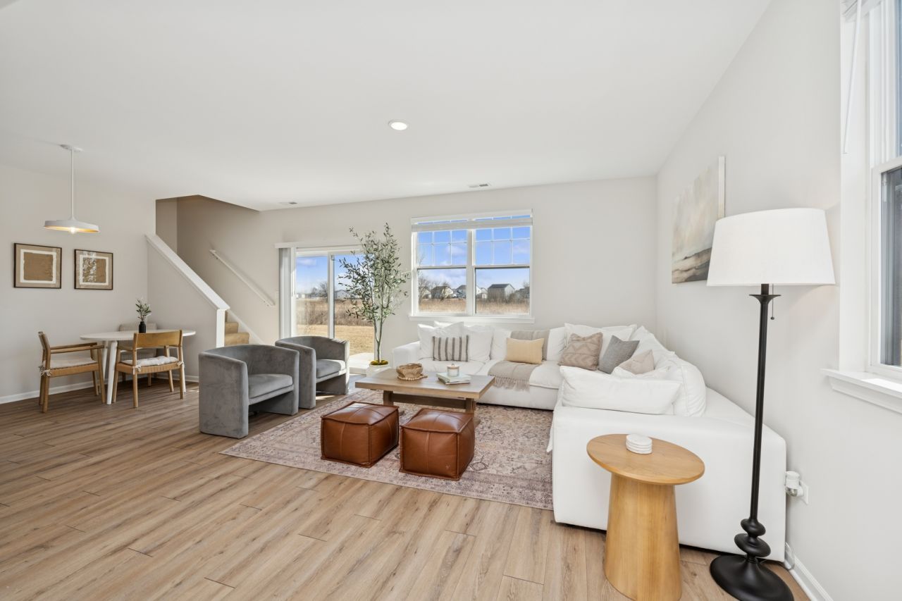 3-bedroom 2.5-bathroom Campania END-unit townhome. From the moment you step inside, you'll experience an open and airy floor plan, designed for optimal living and seamless flow, perfect for both entertaining and everyday comfort. The show stopping eat-in kitchen features quartz countertops, shiny GE stainless steel appliances, and an abundance of cabinet space, sure to delight any home chef. This space seamlessly flows into the sun-drenched living room and dedicated dining area, creating a warm and inviting atmosphere. Retreat upstairs to the oversized primary bedroom complete with a private en-suite bathroom and a walk-in closet big enough to handle all your wardrobe goals. Head down the hall to the two other generously sized bedrooms. Enjoy the convenience of second-floor laundry, adding to the home's practicality. Please note that images are of a previously built model; finishes and features may vary. $150 HOA fee will be added to the base rent. This includes lawncare, snow removal, preventative maintenance and maintenance free living.